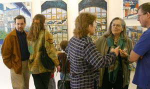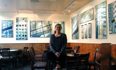 The paintings, all done in oil on board, were conceived out of Wendy's reaction to Manhattan, when she confronted this amazing city for the first time a couple of years ago. Although the works depict the effects of light upon windows, and the tricks such reflections play, they also say much about the vulnerability of such buildings which, as we all know, were to pay a dreadful price for their monumental size last September. Wendy says the paintings are all about ambiguity. You see these tall, proud, solid buildings against the blue that permeates New York and assume they are strong - yet they are not. She has captured their assumed strength set against their vulnerability. We see faces at windows. We see reflections. We see grids. We also see the way those reflections capture the reflection of the reflections, fragments of a transitory world trapped in a giant frame. Distorted though they are by sunlight, these reflections display the complexity of the city below while capturing the strange beauty of its buildings which tower into the sky.